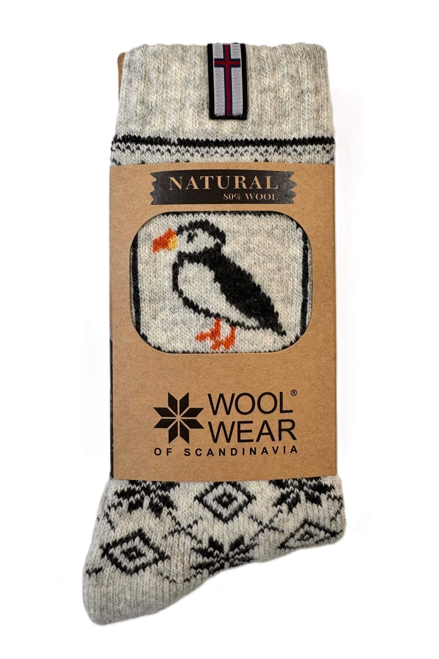 Dejligt varme, bløde og kraftige uldsokker fra WOOLWEAR of Scandinavia af 80% uld, med flot lille vævet Færøsk flag på skaftet, med klassisk strikkemønster samt sødt lundemotiv.